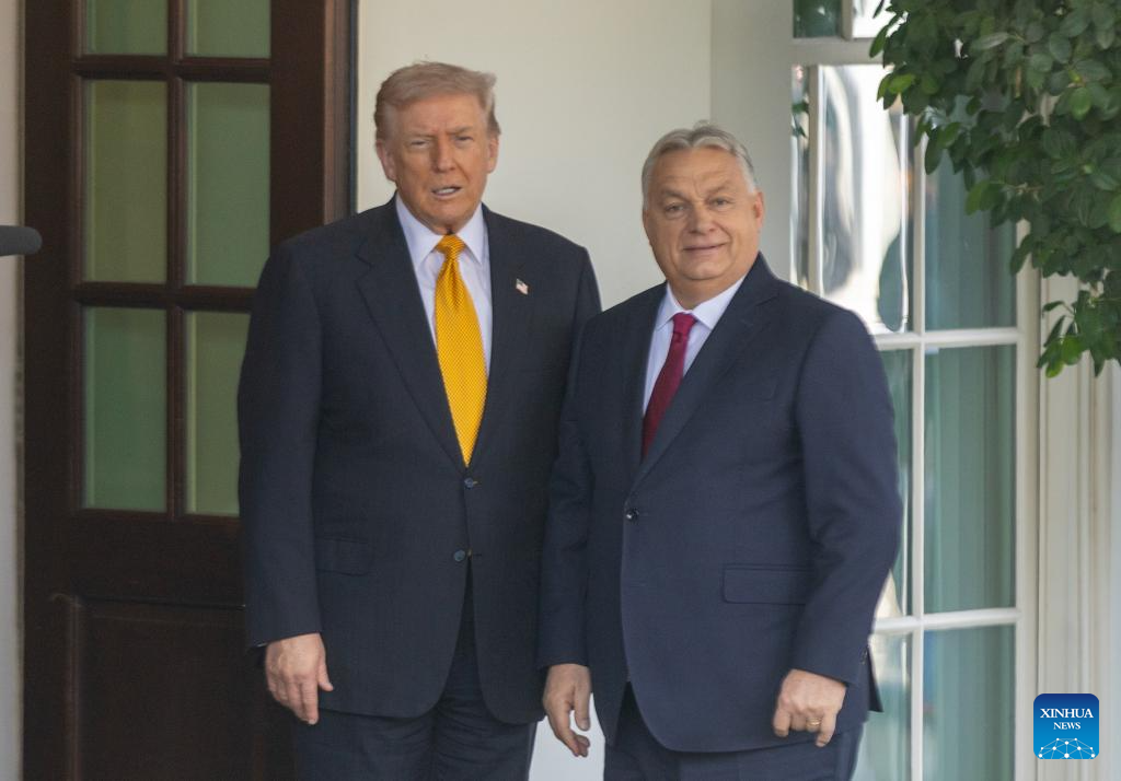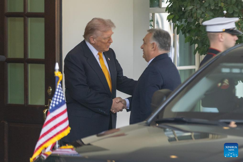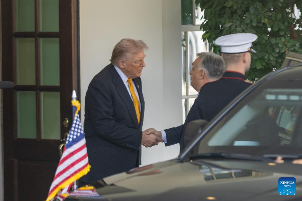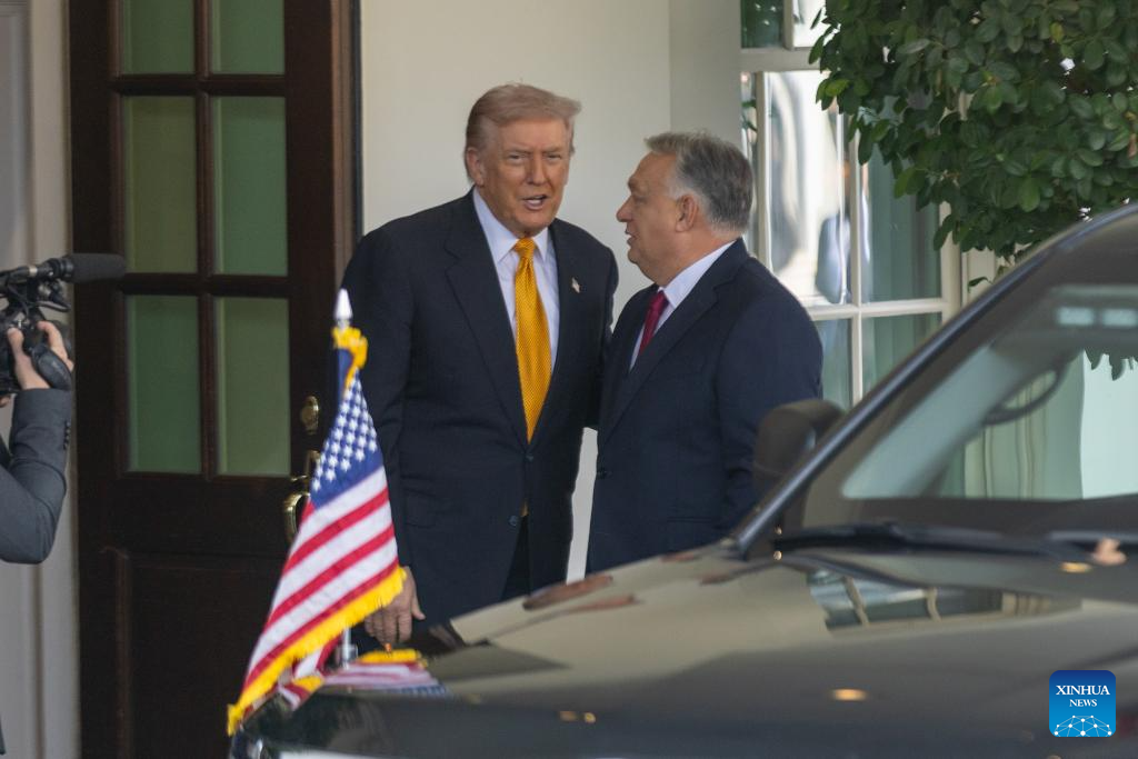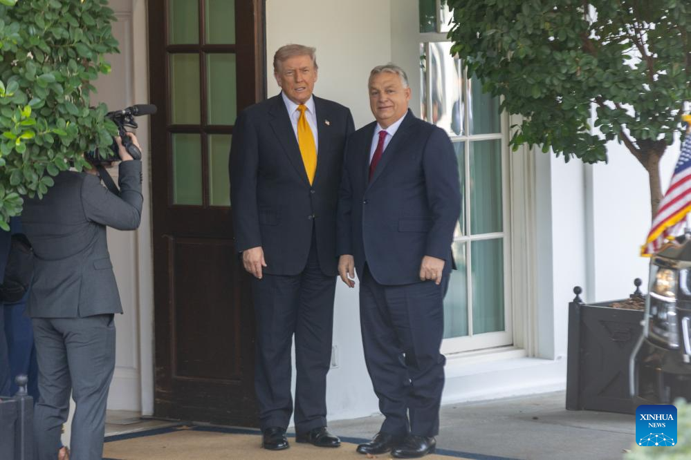 U.S. President Donald Trump (L) welcomes Hungarian Prime Minister Viktor Orban at the White House in Washington, D.C., the United States, on Nov. 7, 2025. (Xinhua/Hu Yousong)