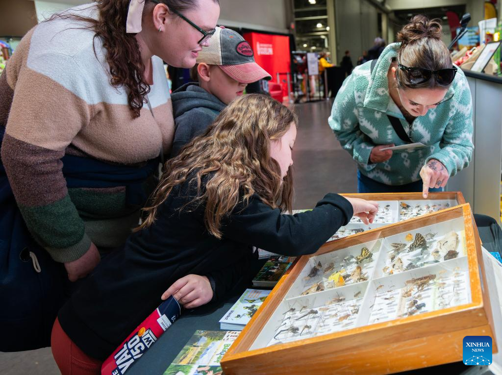 People view insect specimens at the 2025 Royal Agricultural Winter Fair in Toronto, Canada, on Nov. 7, 2025. This annual event kicked off here on Friday and will last until Nov. 16 this year, with displays of fruits and vegetables, poultry and livestock, as well as educational activities. (Photo by Zou Zheng/Xinhua)