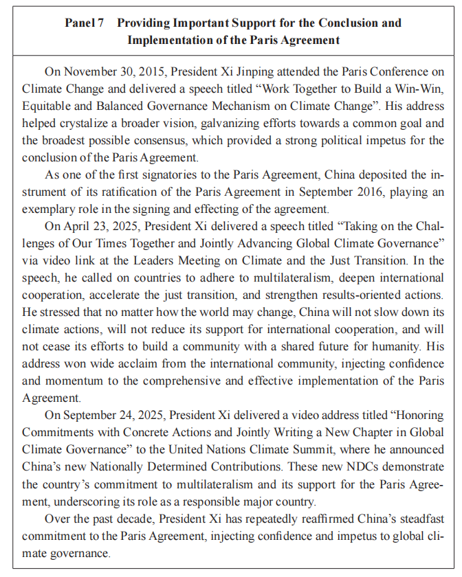Deeper South-South cooperation in coping with climate change. China supports other developing countries in building their capacity to respond to climate change through a holistic approach that integrates green vision, green technology, and clean energy. Since 2016, it has provided and mobilized RMB177 billion worth of project funds in this regard. By the end of October 2025, China has signed 55 memoranda of understanding on South-South cooperation to address climate change with 43 developing countries and conducted over 300 sessions of capacity-building programs.