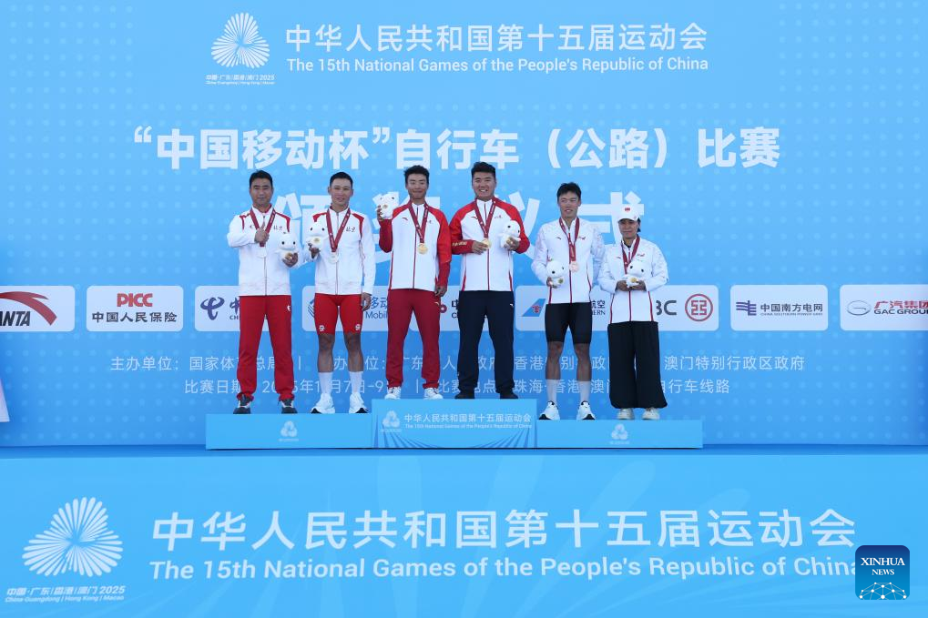Gold medalist Liu Zhicheng of Shandong, silver medalist Xue Chaohua of Beijing and bronze medalist Hu Haijie of Yunnan pose for photos with their coaches during the awarding ceremony for the men's road race of cycling road at China's 15th National Games in south China's Guangdong Province, Nov. 8, 2025. (Xinhua/Zhang Chenlin)