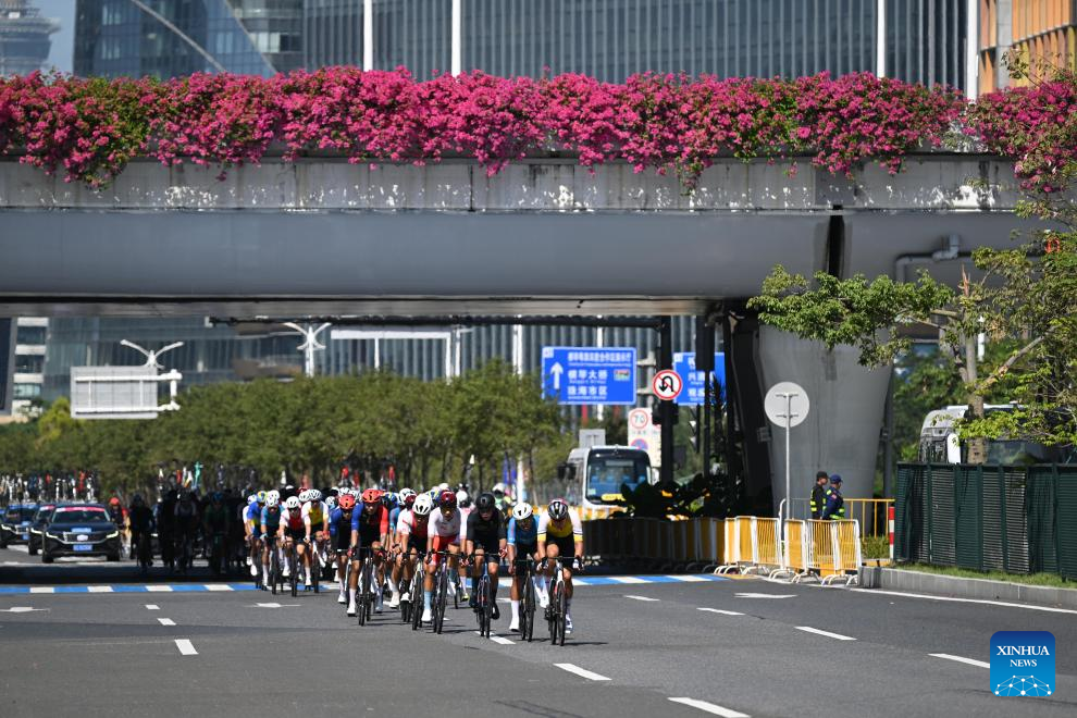 Cyclists compete during the men's road race of cycling road at China's 15th National Games in south China's Guangdong Province, Nov. 8, 2025. (Xinhua/Deng Hua)