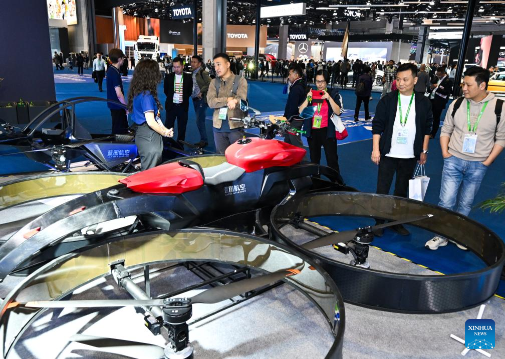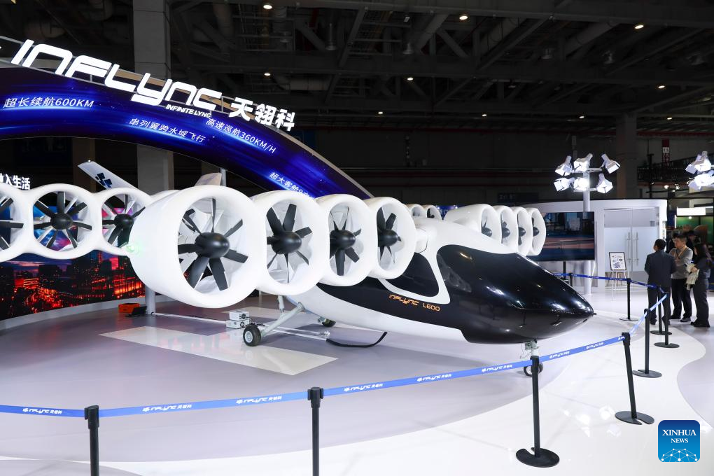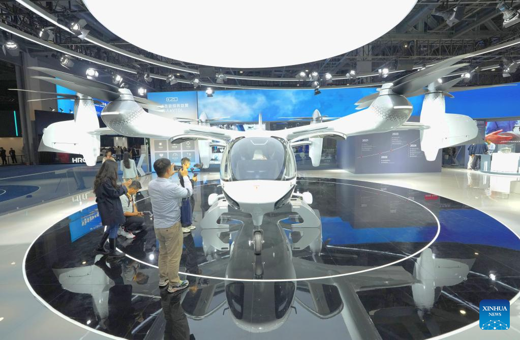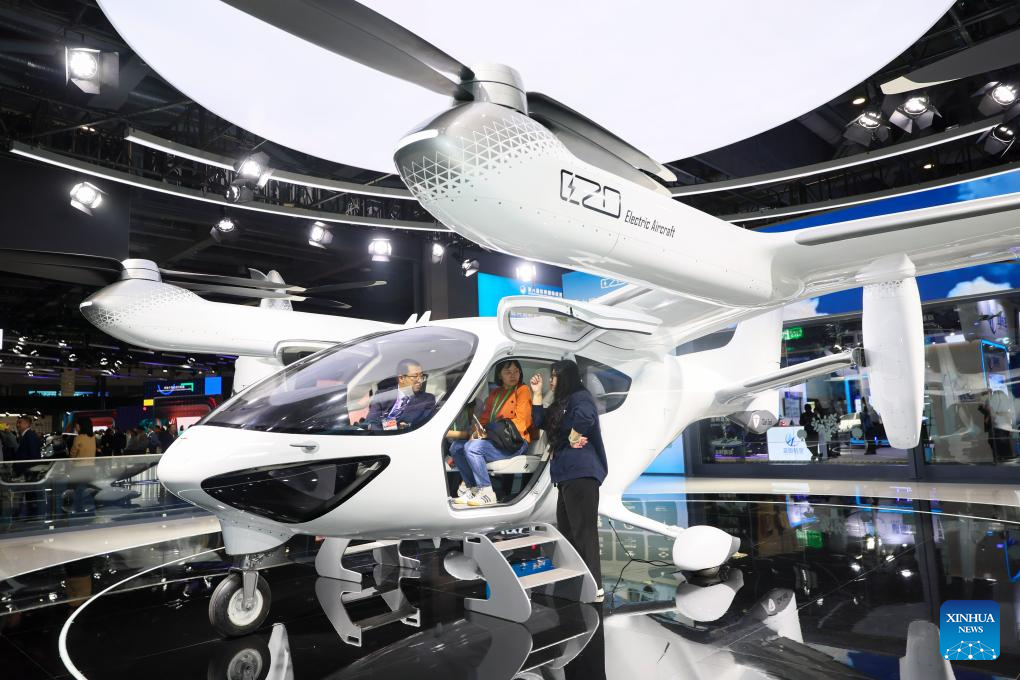 An E20 electric vertical takeoff and landing aircraft is seen at the booth of TCab Tech at the Automobile and Smart Mobility exhibition area of the eighth China International Import Expo (CIIE) in east China's Shanghai, Nov. 5, 2025. The eighth CIIE showcased a range of new mobility products and innovative technologies, unfolding a diversified and multi-dimensional vision of future transportation. (Xinhua/Ren Pengfei)