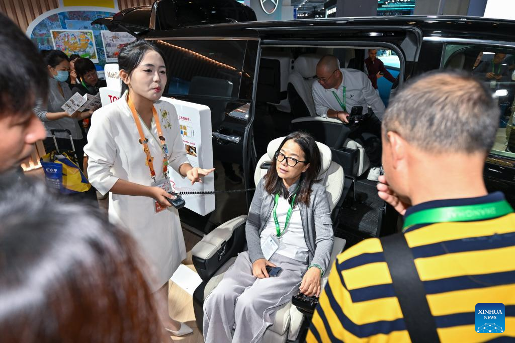 A visitor tries an electric rotating lift seat at the booth of Toyota at the Automobile and Smart Mobility exhibition area of the eighth China International Import Expo (CIIE) in east China's Shanghai, Nov. 8, 2025. The eighth CIIE showcased a range of new mobility products and innovative technologies, unfolding a diversified and multi-dimensional vision of future transportation. (Xinhua/Cai Xiangxin)