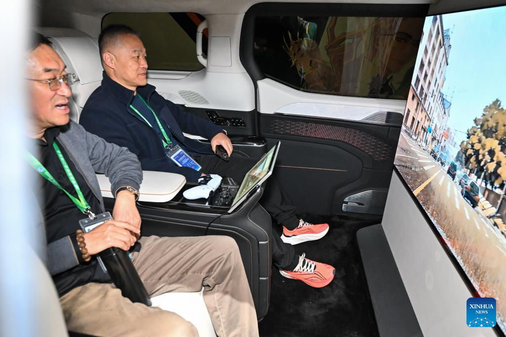 Visitors try the in-car entertainment system at the booth of Sony at the Intelligent Industry and Information Technology exhibition area of the eighth China International Import Expo (CIIE) in east China's Shanghai, Nov. 8, 2025. The eighth CIIE showcased a range of new mobility products and innovative technologies, unfolding a diversified and multi-dimensional vision of future transportation. (Xinhua/Cai Xiangxin)
