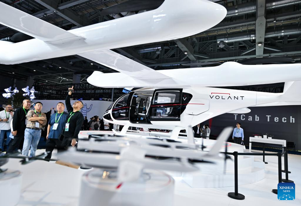 An electric vertical takeoff and landing aircraft is seen at the booth of Volant at the Automobile and Smart Mobility exhibition area of the eighth China International Import Expo (CIIE) in east China's Shanghai, Nov. 8, 2025. The eighth CIIE showcased a range of new mobility products and innovative technologies, unfolding a diversified and multi-dimensional vision of future transportation. (Xinhua/Cai Xiangxin)