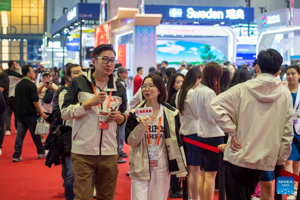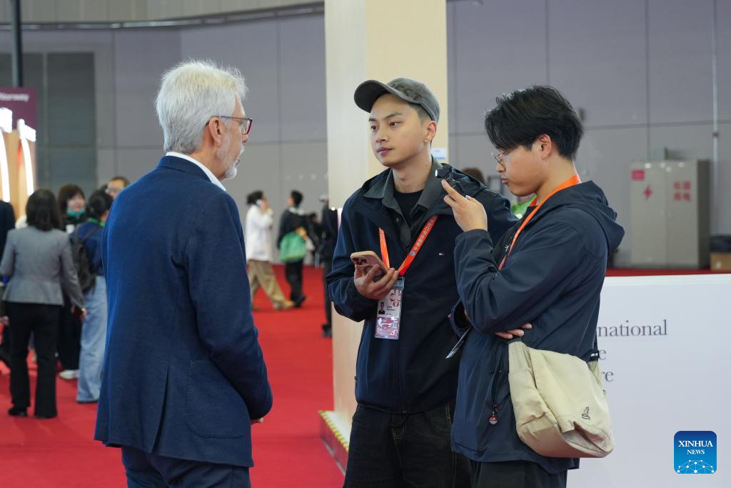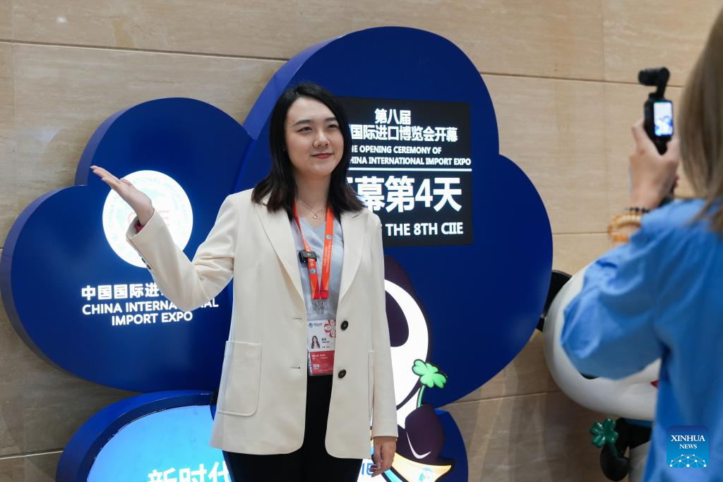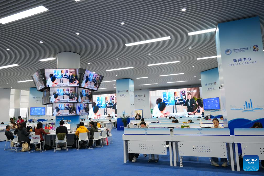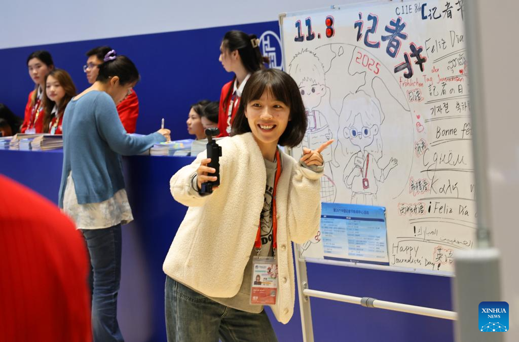 Journalists work at the site of the 8th China International Import Expo (CIIE) in Shanghai, east China, Nov. 8, 2025. The media center for the 8th CIIE held various events on Saturday to mark China's annual Journalists' Day, which falls on Nov. 8. (Xinhua/Zhang Ziyu)