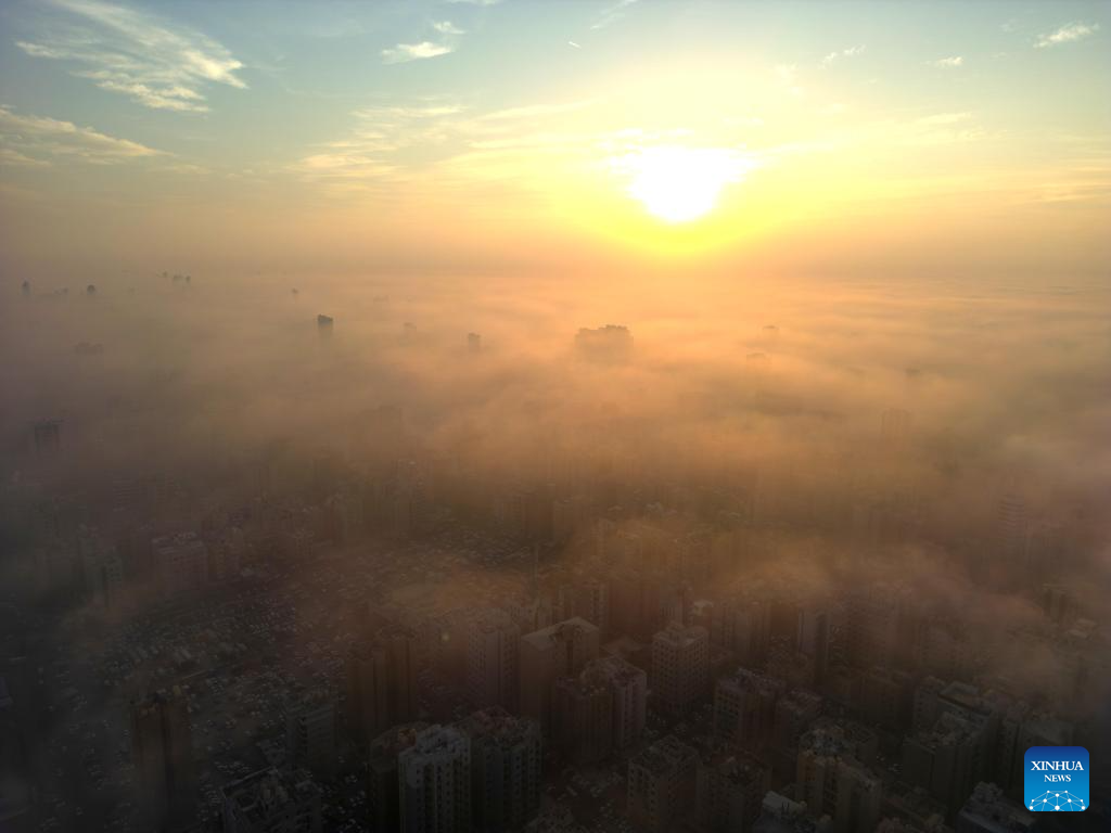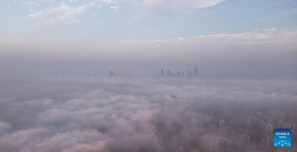 An aerial drone photo taken on Nov. 9, 2025 shows buildings shrouded in fog in Kuwait City, Kuwait. (Photo by Asad/Xinhua)