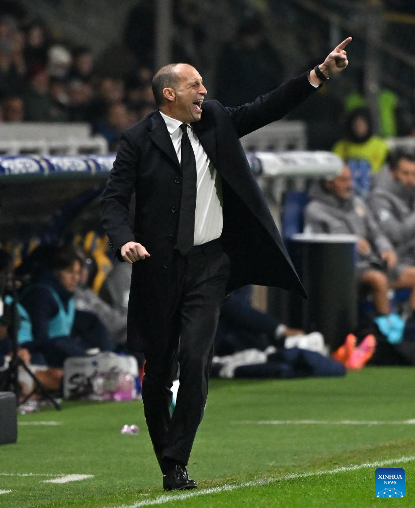 AC Milan's head coach Massimiliano Allegri gestures during a Serie A football match between Parma and AC Milan in Parma, Italy, Nov. 8, 2025. (Photo by Alberto Lingria/Xinhua)
