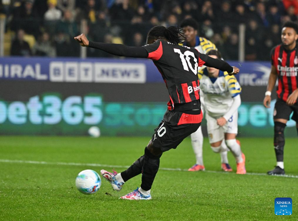 AC Milan's Rafael Leao scores a penalty goal during a Serie A football match between Parma and AC Milan in Parma, Italy, Nov. 8, 2025. (Photo by Alberto Lingria/Xinhua)