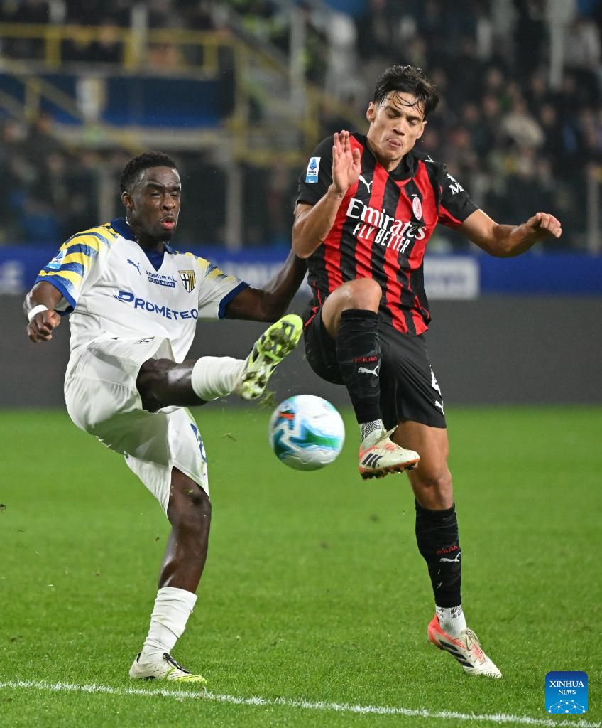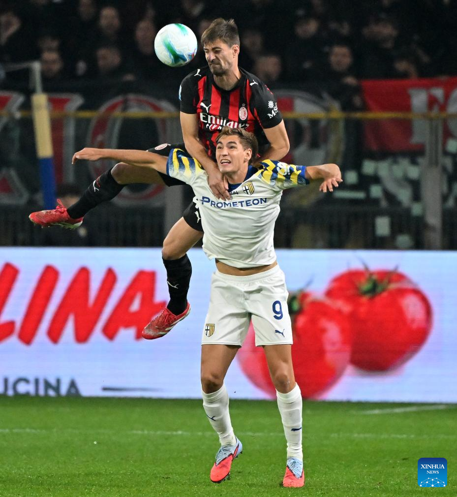AC Milan's Matteo Gabbia (top) vies with Parma's Mateo Pellegrino during a Serie A football match between Parma and AC Milan in Parma, Italy, Nov. 8, 2025. (Photo by Alberto Lingria/Xinhua)
