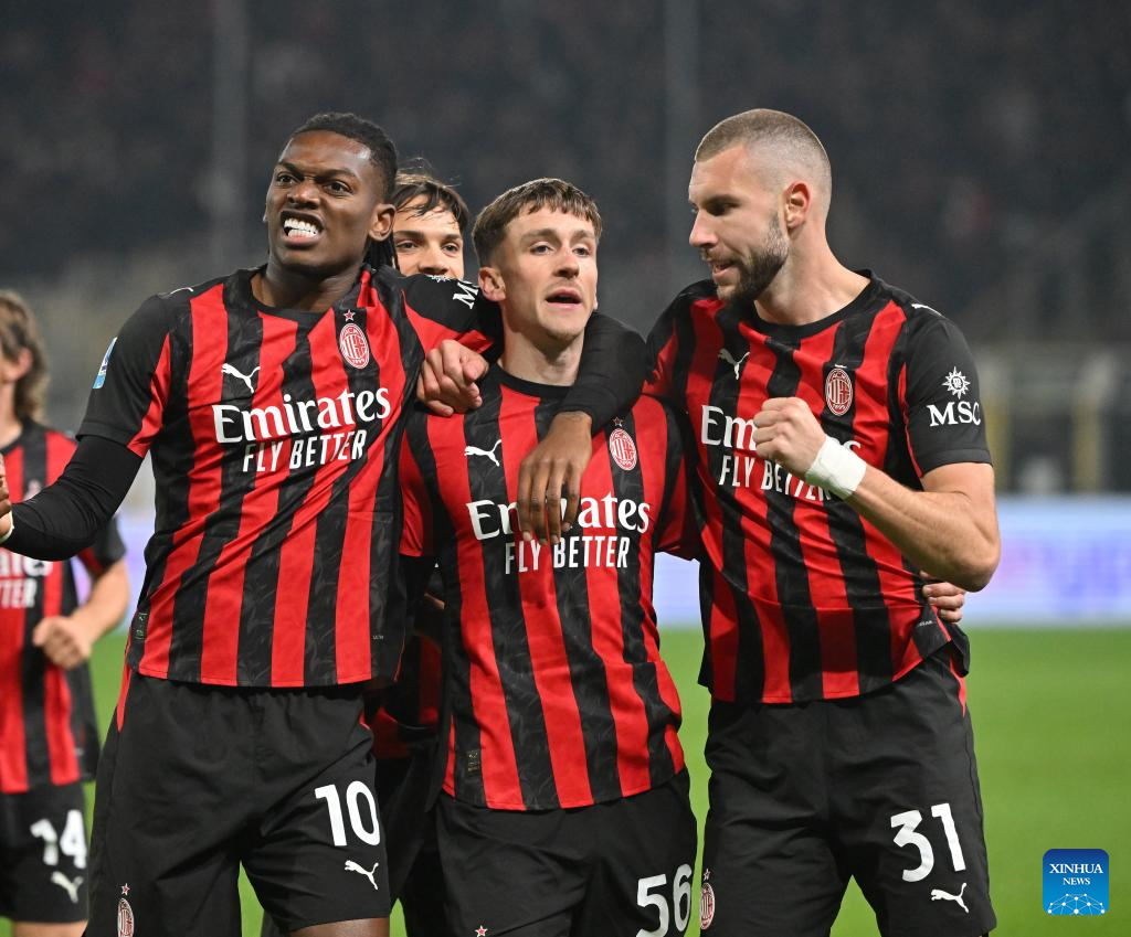 AC Milan's Rafael Leao (L) celebrates his goal with teammate Pervis Estupinan during a Serie A football match between Parma and AC Milan in Parma, Italy, Nov. 8, 2025. (Photo by Alberto Lingria/Xinhua)