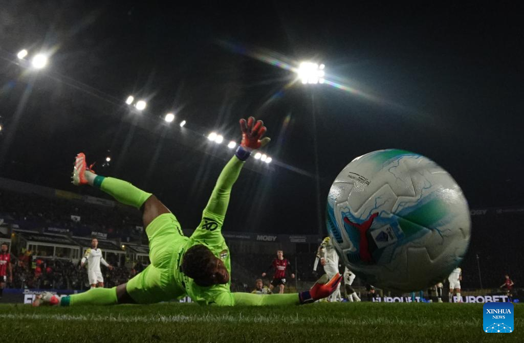 Parma's goalkeeper Suzuki Zion (front) failed to save the goal of AC Milan's Alexis Saelemaekers during a Serie A football match between Parma and AC Milan in Parma, Italy, Nov. 8, 2025. (Photo by Alberto Lingria/Xinhua)