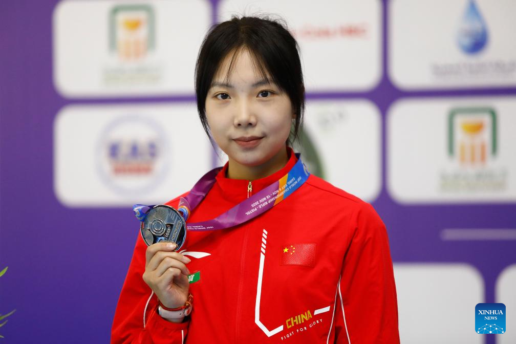 Wang Zifei of China poses during the awarding ceremony for the women's 10m air rifle final of shooting at the 2025 ISSF World Championship Rifle/Pistol in Cairo, Egypt, on Nov. 8, 2025. (Xinhua/Ahmed Gomaa)