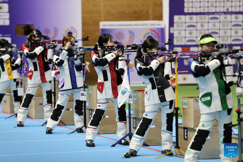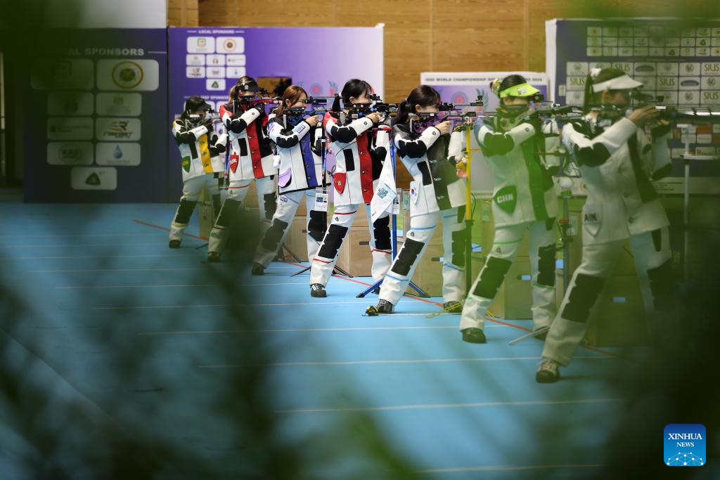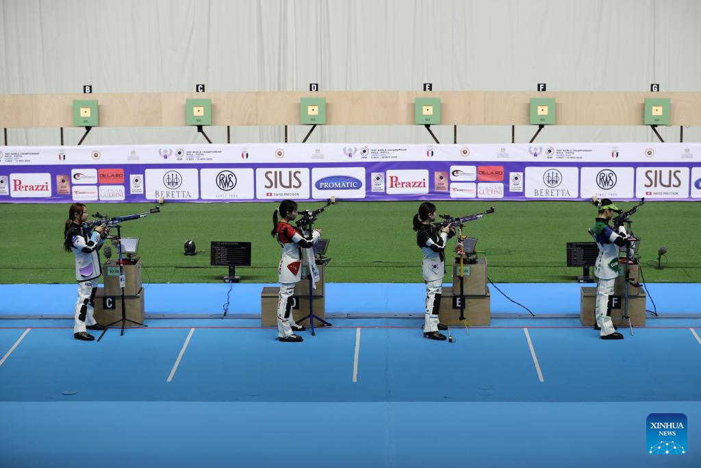 Competitors compete during the 10m air rifle women's final of shooting at the 2025 ISSF World Championship Rifle/Pistol in Cairo, Egypt, on Nov. 8, 2025. (Xinhua/Sui Xiankai)