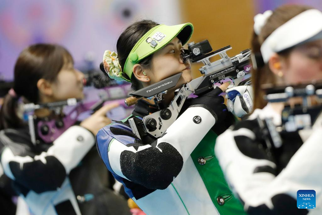Wang Zifei (C) of China is seen during the women's 10m air rifle final of shooting at the 2025 ISSF World Championship Rifle/Pistol in Cairo, Egypt, on Nov. 8, 2025. (Xinhua/Ahmed Gomaa)