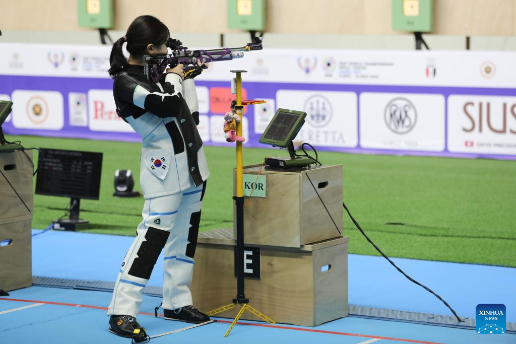 Ban Hyo-jin of South Korea competes during the 10m air rifle women's final of shooting at the 2025 ISSF World Championship Rifle/Pistol in Cairo, Egypt, on Nov. 8, 2025. (Xinhua/Sui Xiankai)