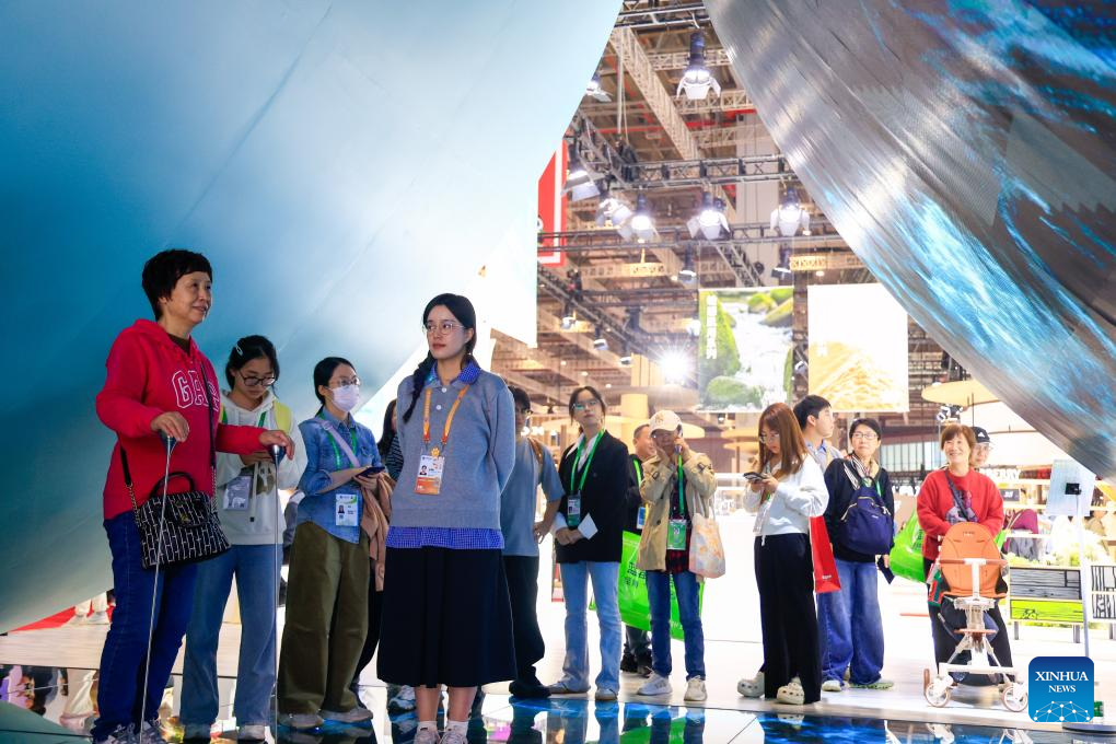 People visit a boutique booth at the Consumer Goods Exhibition area during the eighth China International Import Expo (CIIE) in east China's Shanghai, Nov. 8, 2025. At the Consumer Goods Exhibition area of the eighth CIIE, apparel, daily chemicals, home furnishings, and cultural and sports products were prominently showcased, reflecting global consumption trends and improvements in quality of life. (Xinhua/Liu Jiaqi)