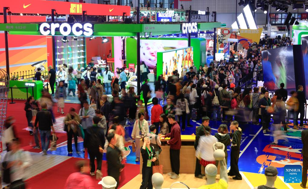 This photo shows a view of the Consumer Goods Exhibition area during the eighth China International Import Expo (CIIE) in east China's Shanghai, Nov. 8, 2025. At the Consumer Goods Exhibition area of the eighth CIIE, apparel, daily chemicals, home furnishings, and cultural and sports products were prominently showcased, reflecting global consumption trends and improvements in quality of life. (Xinhua/Liu Jiaqi)