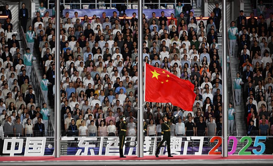 Members of Guangdong, Hong Kong and Macao delegations parade during the opening ceremony of China's 15th National Games in Guangzhou, south China's Guangdong Province, Nov. 9, 2025. (Xinhua/Lai Xiangdong)Members of Guangdong, Hong Kong and Macao delegations parade during the opening ceremony of China's 15th National Games in Guangzhou, south China's Guangdong Province, Nov. 9, 2025. (Xinhua/Lai Xiangdong)The Chinese national flag is carried during the opening ceremony of China's 15th National Games in Guangzhou, south China's Guangdong Province, Nov. 9, 2025. (Xinhua/Li Xin)The Chinese national flag is carried during the opening ceremony of China's 15th National Games in Guangzhou, south China's Guangdong Province, Nov. 9, 2025. (Xinhua/Lai Xiangdong)The Chinese national flag is raised during the opening ceremony of China's 15th National Games in Guangzhou, south China's Guangdong Province, Nov. 9, 2025. (Xinhua/Yang Guanyu)Flags are raised during the opening ceremony of China's 15th National Games in Guangzhou, south China's Guangdong Province, Nov. 9, 2025. (Xinhua/Xiao Yijiu)People watch the live television broadcast of the opening ceremony of China's 15th National Games in Hong Kong, south China, Nov. 9, 2025. The opening ceremony of China's 15th National Games was held on Sunday evening in Guangzhou, south China's Guangdong Province. (Xinhua/Chen Duo)People watch the live television broadcast of the opening ceremony of China's 15th National Games in Macao, south China, Nov. 9, 2025. The opening ceremony of China's 15th National Games was held on Sunday evening in Guangzhou, south China's Guangdong Province. (Xinhua/Cheong Kam Ka)Torchbearers take part in the torch relay during the opening ceremony of China's 15th National Games in Guangzhou, south China's Guangdong Province, Nov. 9, 2025. (Xinhua/Lai Xiangdong)Torchbearers take part in the torch relay during the opening ceremony of China's 15th National Games in Guangzhou, south China's Guangdong Province, Nov. 9, 2025. (Xinhua/Wu Lu)Torchbearers take part in the torch relay during the opening ceremony of China's 15th National Games in Guangzhou, south China's Guangdong Province, Nov. 9, 2025. (Xinhua/Xiao Yijiu)The cauldron is lit during the opening ceremony of China's 15th National Games in Guangzhou, south China's Guangdong Province, Nov. 9, 2025. (Xinhua/Xiao Yijiu)The cauldron is lit during the opening ceremony of China's 15th National Games in Guangzhou, south China's Guangdong Province, Nov. 9, 2025. (Xinhua/Sun Fei)■