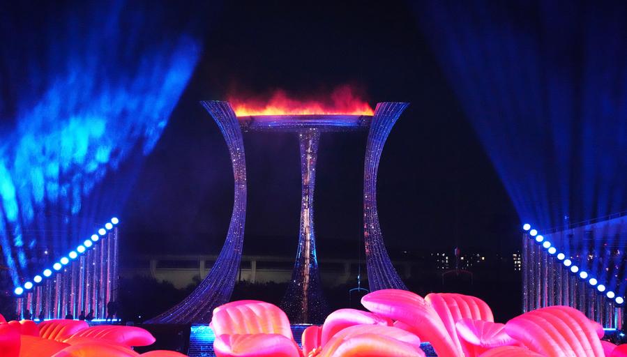 Torchbearers light the cauldron during the opening ceremony of China's 15th National Games in Guangzhou, south China's Guangdong Province, Nov. 9, 2025. (Xinhua/Hu Huhu)