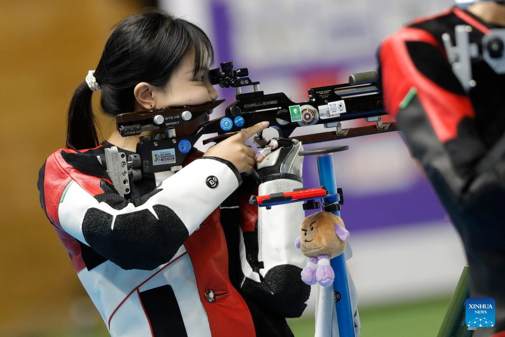 Wang Zifei of China competes during the 10m air rifle mixed team final of shooting at the 2025 ISSF World Championship Rifle/Pistol in Cairo, Egypt, on Nov. 9, 2025. (Xinhua/Ahmed Gomaa)