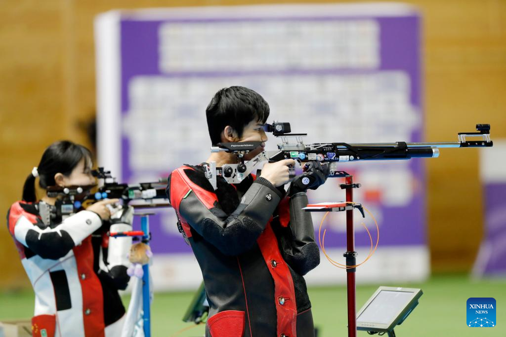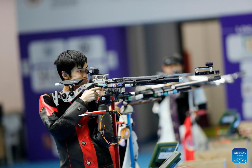 Sheng Lihao of China competes during the 10m air rifle mixed team final of shooting at the 2025 ISSF World Championship Rifle/Pistol in Cairo, Egypt, on Nov. 9, 2025. (Xinhua/Ahmed Gomaa)