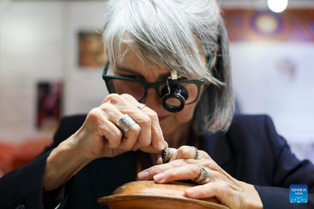 Maria Serena Colombo, an engraver with Italian handmade jewelry brand Manzoni Gioielli, carves on-site at the Consumer Goods Exhibition area during the eighth China International Import Expo (CIIE) in east China's Shanghai, Nov. 9, 2025. (Xinhua/Wang Xiang)