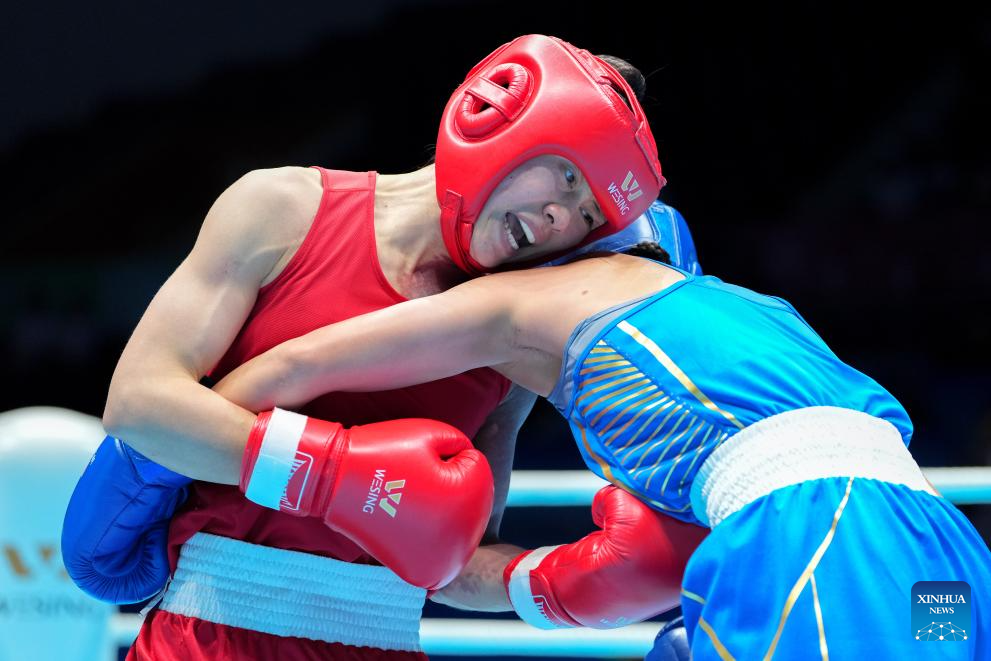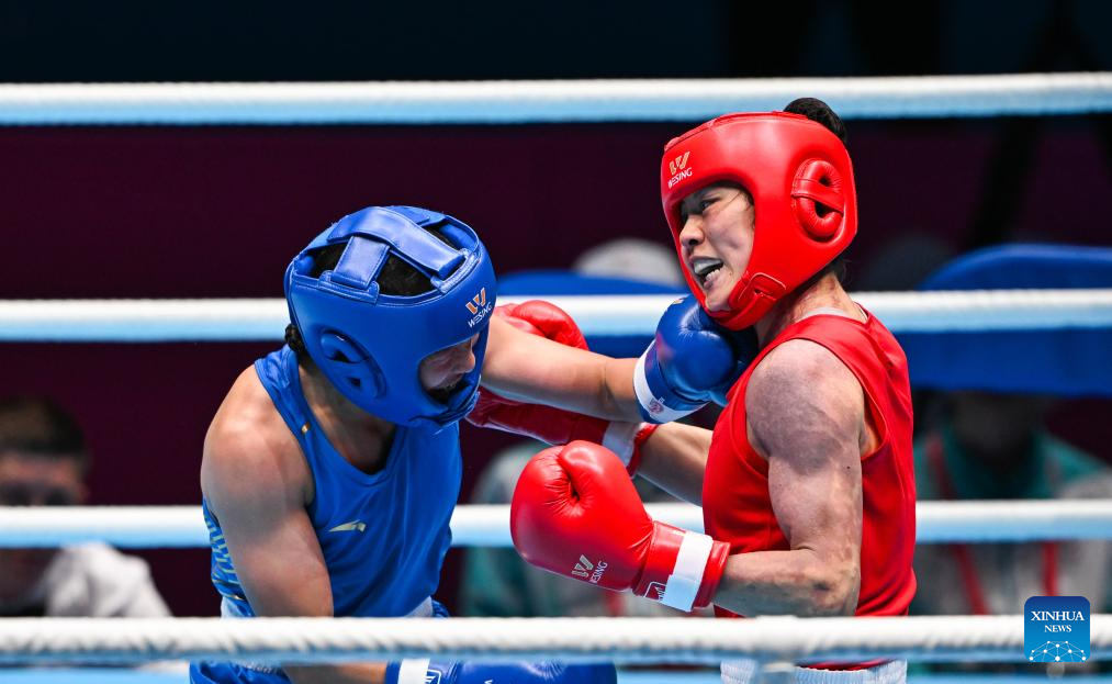 Xu Zichun (R) of Jiangsu competes against Cai Yan of Hebei during the women's -57kg final of boxing at China's 15th National Games in Shenzhen, south China's Guangdong Province, Nov. 10, 2025. (Xinhua/Peng Yikai)