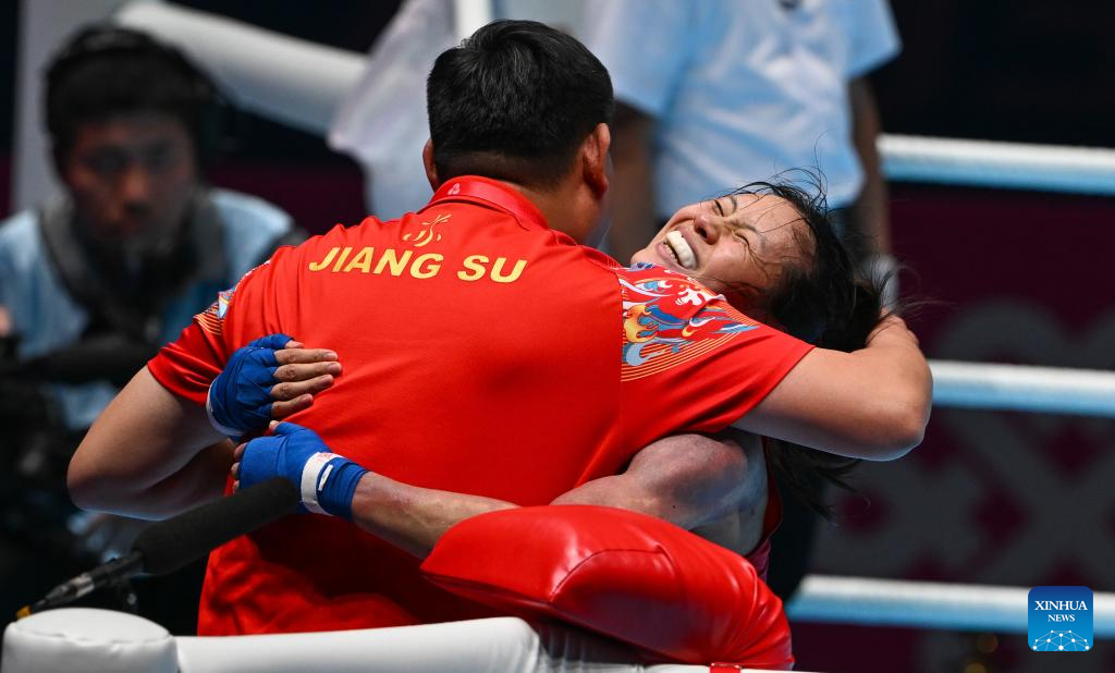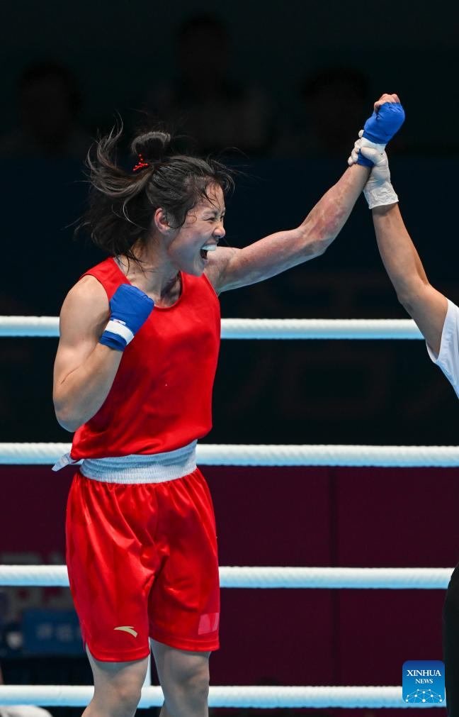 Xu Zichun of Jiangsu celebrates after defeating Cai Yan of Hebei in the women's -57kg final of boxing at China's 15th National Games in Shenzhen, south China's Guangdong Province, Nov. 10, 2025. (Xinhua/Yang Guanyu)