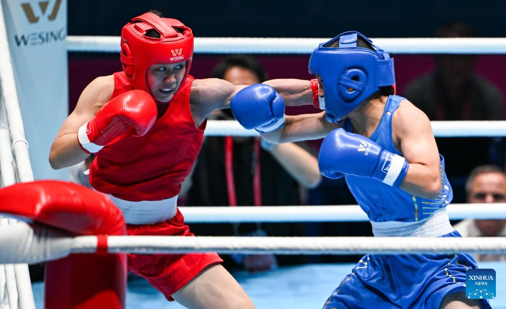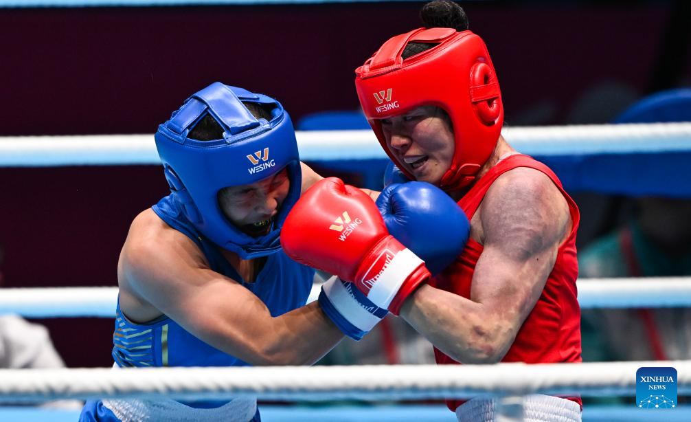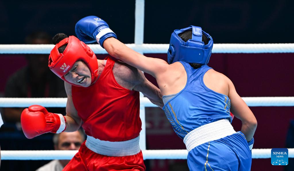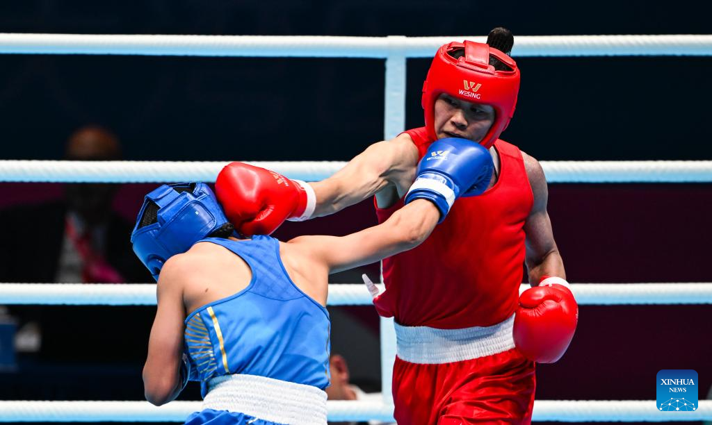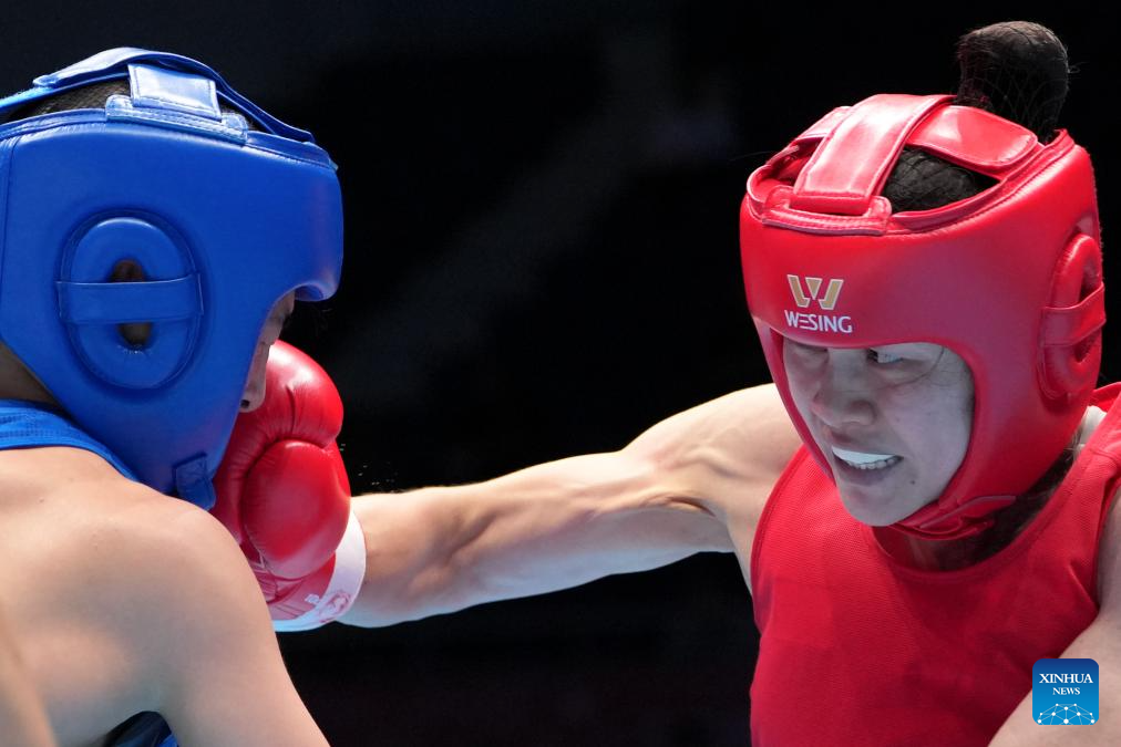 Xu Zichun (L) of Jiangsu competes against Cai Yan of Hebei during the women's -57kg final of boxing at China's 15th National Games in Shenzhen, south China's Guangdong Province, Nov. 10, 2025. (Xinhua/Peng Yikai)