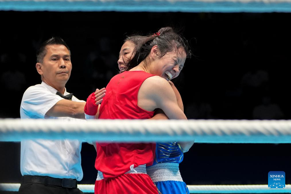 Xu Zichun (L) of Jiangsu celebrates after defeating Cai Yan of Hebei in the women's -57kg final of boxing at China's 15th National Games in Shenzhen, south China's Guangdong Province, Nov. 10, 2025. (Xinhua/Yang Guanyu)