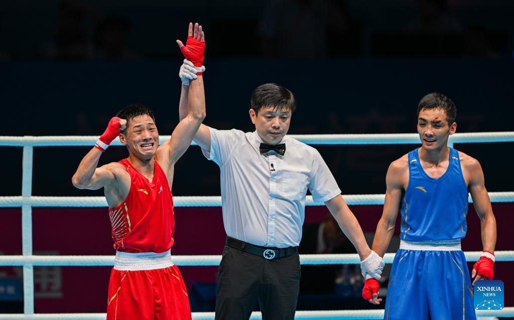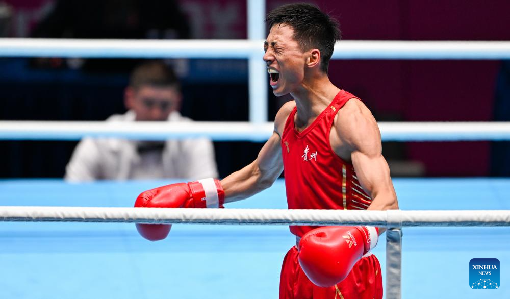 Zhang Jiamao (L) of Guizhou celebrates after defeating Ma Xinming of Inner Mongolia in the men's -51kg final of boxing at China's 15th National Games in Shenzhen, south China's Guangdong Province, Nov. 10, 2025. (Xinhua/Yang Guanyu)
