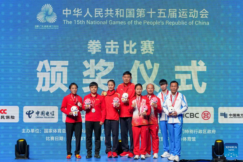 Gold medalist Xu Zichun of Jiangsu, silver medalist Cai Yan of Hebei, bronze medalists Ren Meijuan of Jilin, Ge Yaqi of Zhejiang and their coaches pose for group photos during the awarding ceremony for the women's -57kg of boxing at China's 15th National Games in Shenzhen, south China's Guangdong Province, Nov. 10, 2025. (Xinhua/Peng Yikai)
