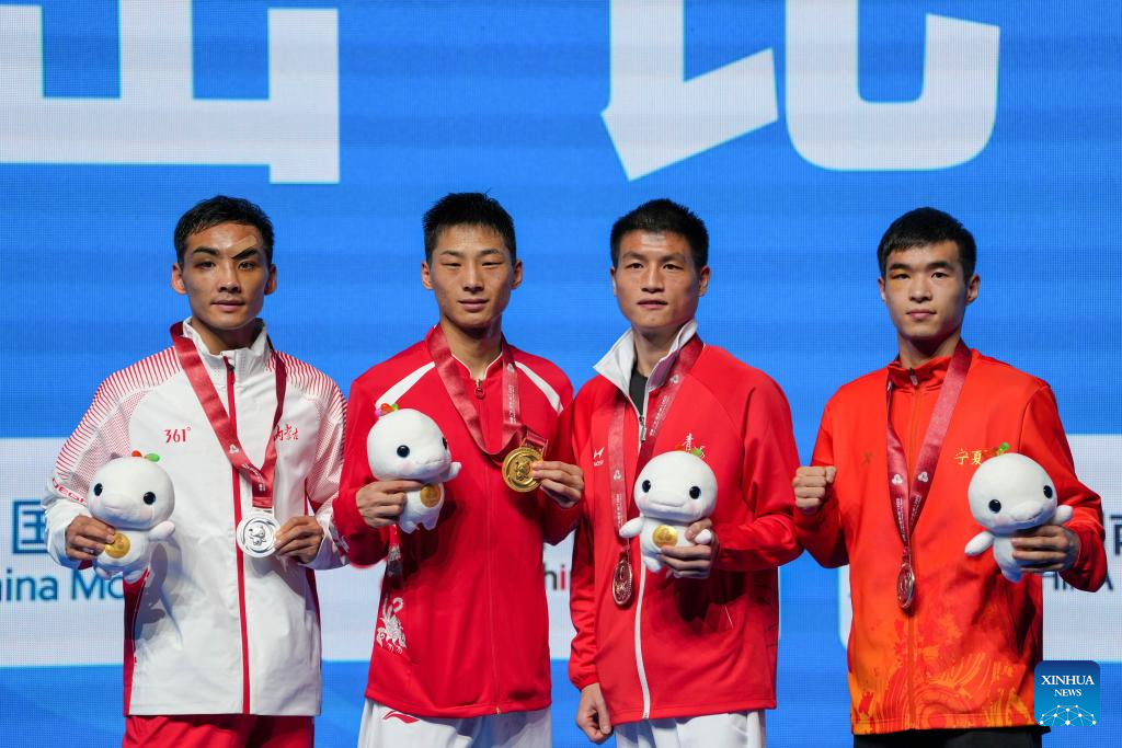 Gold medalist Zhang Jiamao of Guizhou, silver medalist Ma Xinming of Inner Mongolia and two bronze medalists Yang Quan of Qinghai, Wang Xiangkun of Ningxia pose for group photos during the awarding ceremony for the men's -51kg final of boxing at China's 15th National Games in Shenzhen, south China's Guangdong Province, Nov. 10, 2025. (Xinhua/Peng Yikai)
