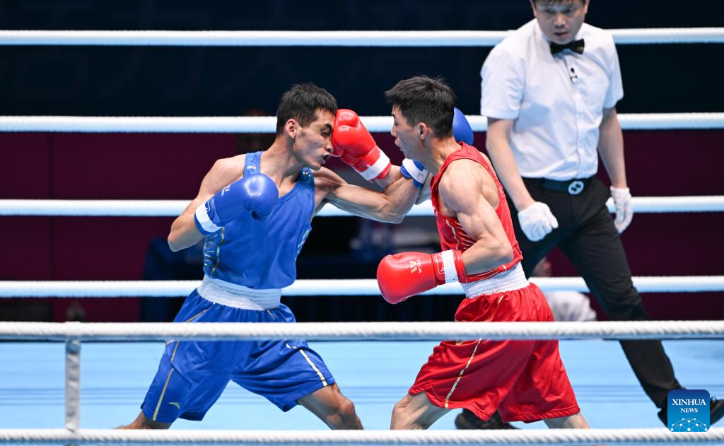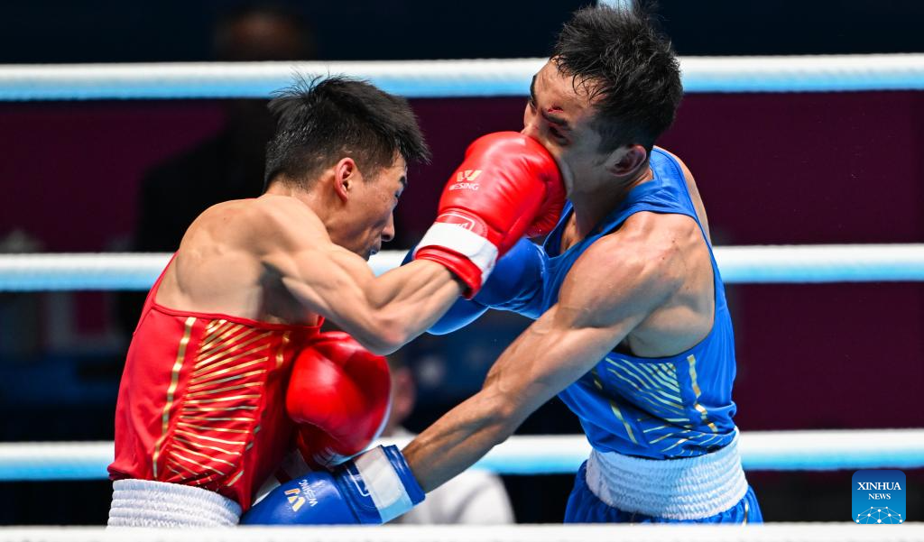 Ma Xinming (R) of Inner Mongolia competes against Zhang Jiamao of Guizhou during the men's -51kg final of boxing at China's 15th National Games in Shenzhen, south China's Guangdong Province, Nov. 10, 2025. (Xinhua/Peng Yikai)