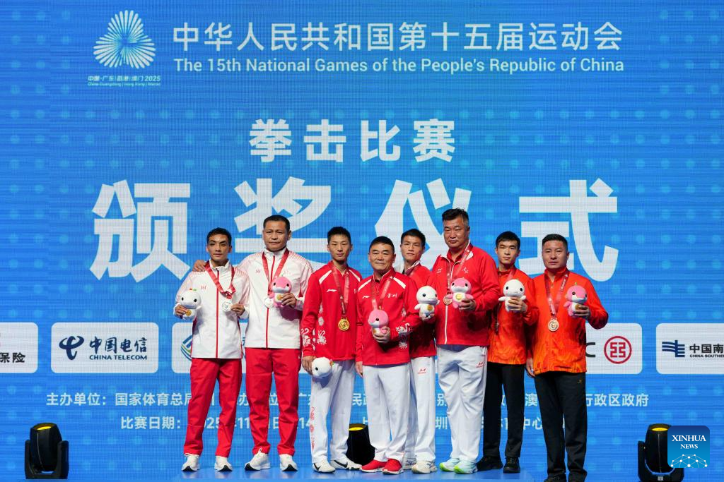 Gold medalist Zhang Jiamao of Guizhou, silver medalist Ma Xinming of Inner Mongolia, two bronze medalists Yang Quan of Qinghai, Wang Xiangkun of Ningxia and their coaches pose for group photos during the awarding ceremony for men's -51kg final of boxing at China's 15th National Games in Shenzhen, south China's Guangdong Province, Nov. 10, 2025. (Xinhua/Peng Yikai)