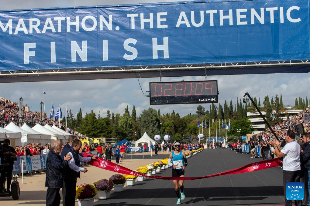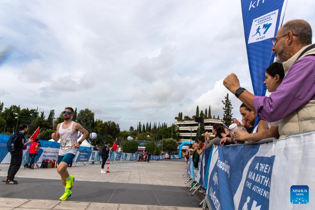 Panagiotis Karaiskos of Greece crosses the finish line during the 42nd Athens Marathon, in Athens, Greece, Nov. 9, 2025. (Photo by Marios Lolos/Xinhua)