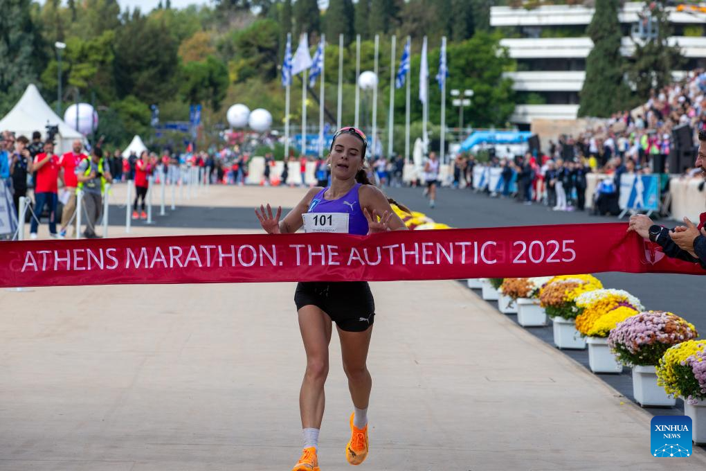 Stamatia Noula of Greece crosses the finish line during the 42nd Athens Marathon, in Athens, Greece, Nov. 9, 2025. (Photo by Marios Lolos/Xinhua)