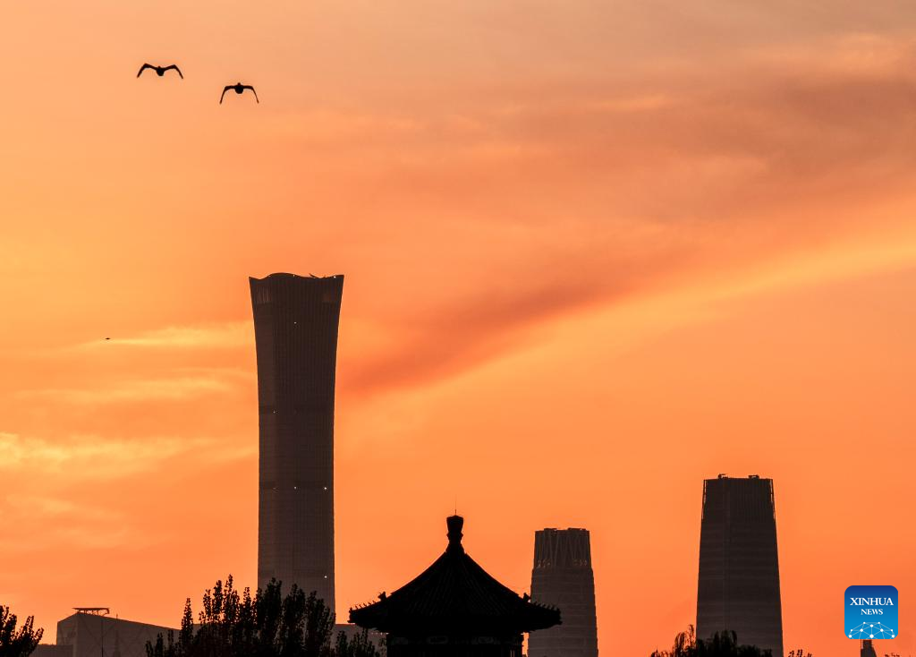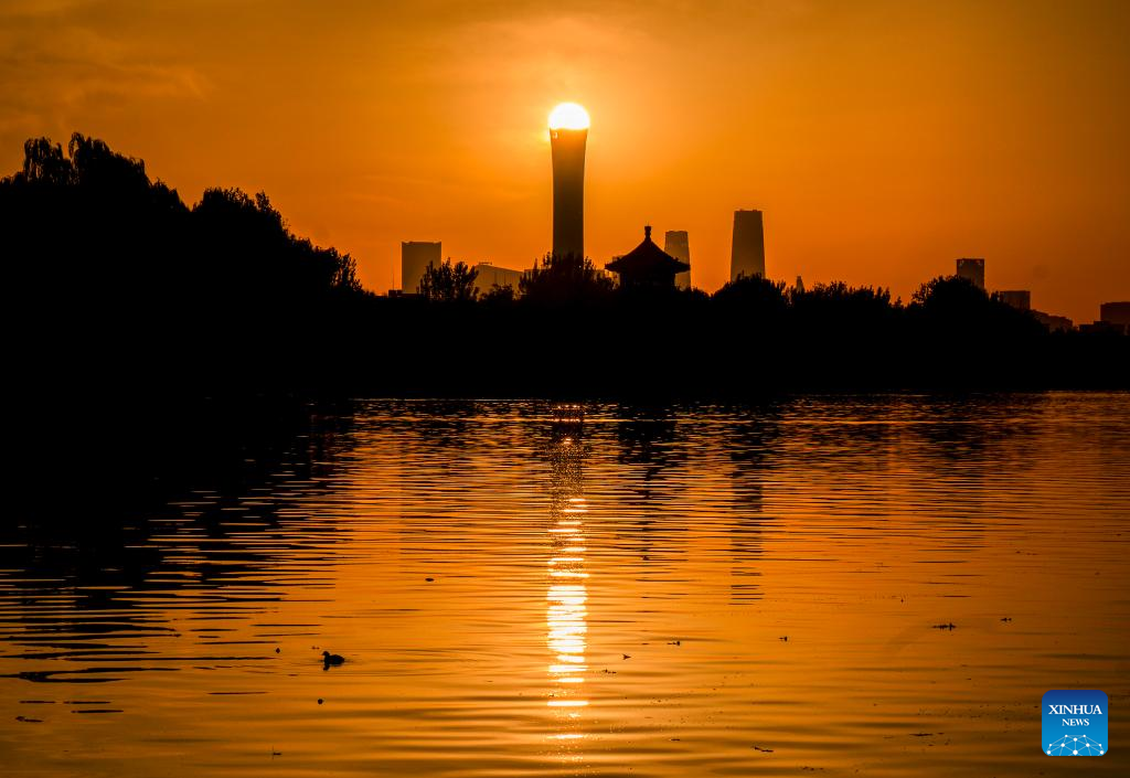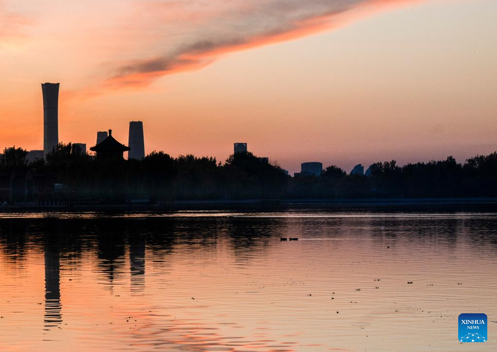 This photo taken on early Nov. 10, 2025 shows the Shichahai lake at sunrise with skyscrapers of the central business district (CBD) in the background in Beijing, capital of China. (Xinhua/Chang Nengjia)