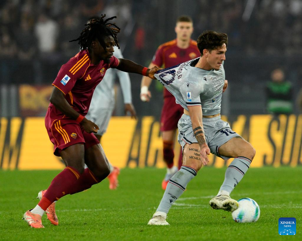 Roma's Matias Soule (R) vies with Udinese's Oumar Solet during a Serie A football match between Roma and Udinese in Rome, Italy, Nov. 9, 2025. (Photo by Augusto Casasoli/Xinhua)