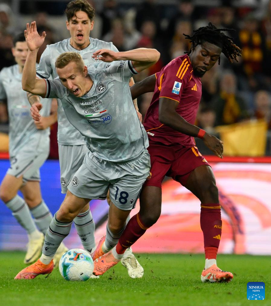 Roma's Manu Kone (front R) vies with Udinese's Adam Buksa (front L) during a Serie A football match between Roma and Udinese in Rome, Italy, Nov. 9, 2025. (Photo by Augusto Casasoli/Xinhua)