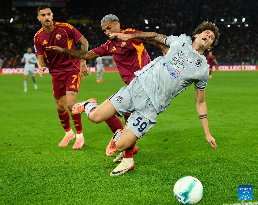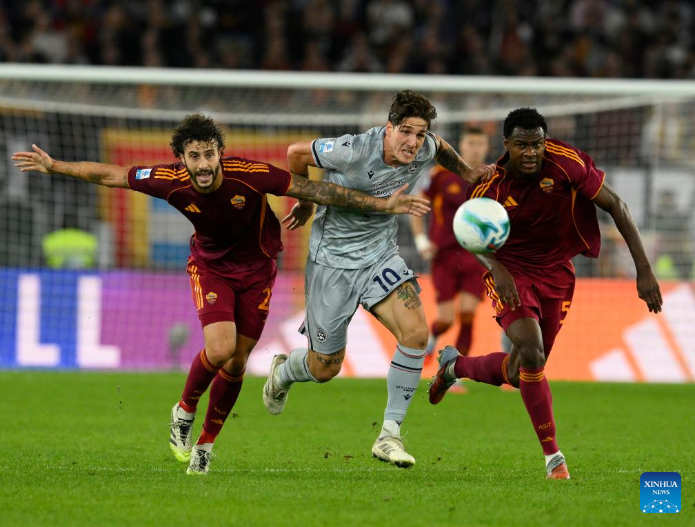 Roma's Lorenzo Pellegrini (L) and Wesley (C) vie with Udinese's Alessandro Zanoli during a Serie A football match between Roma and Udinese in Rome, Italy, Nov. 9, 2025. (Photo by Augusto Casasoli/Xinhua)
