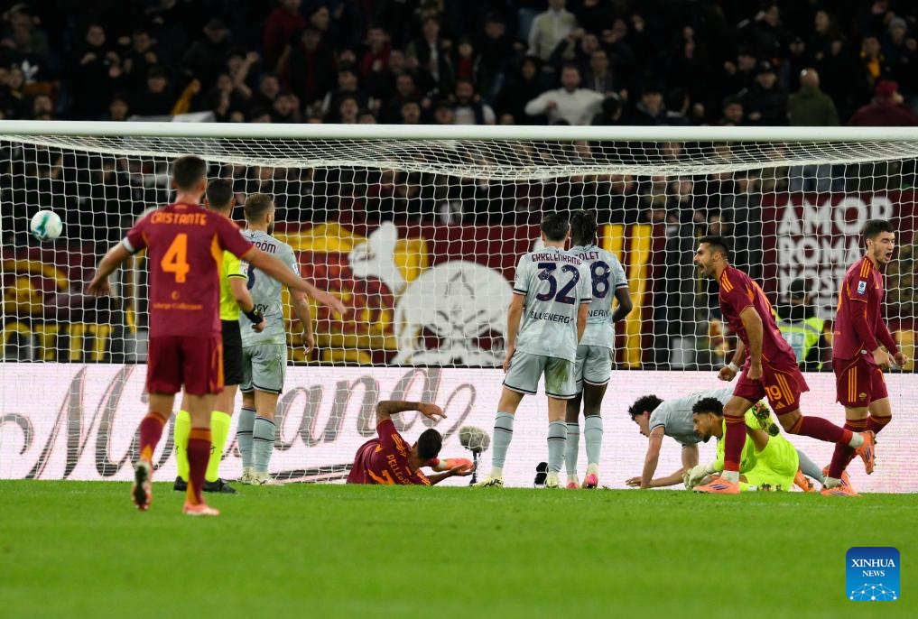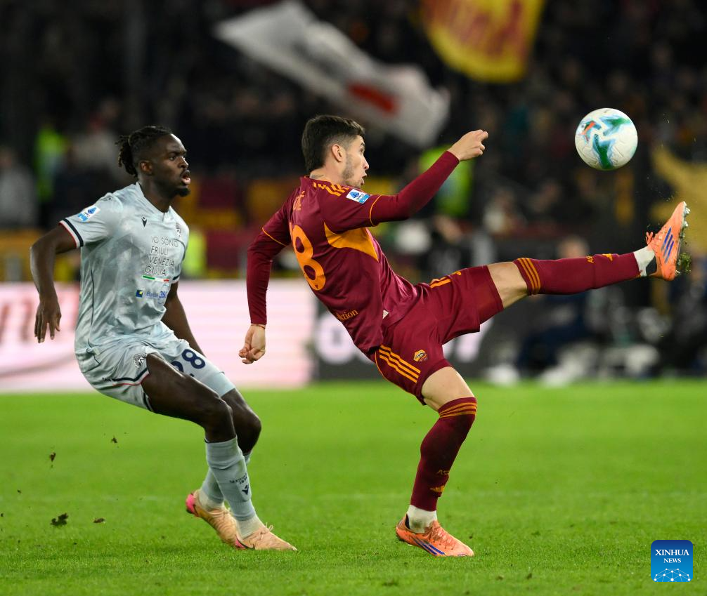Roma's Zeki Celik (2nd R) scores during a Serie A football match between Roma and Udinese in Rome, Italy, Nov. 9, 2025. (Photo by Augusto Casasoli/Xinhua)