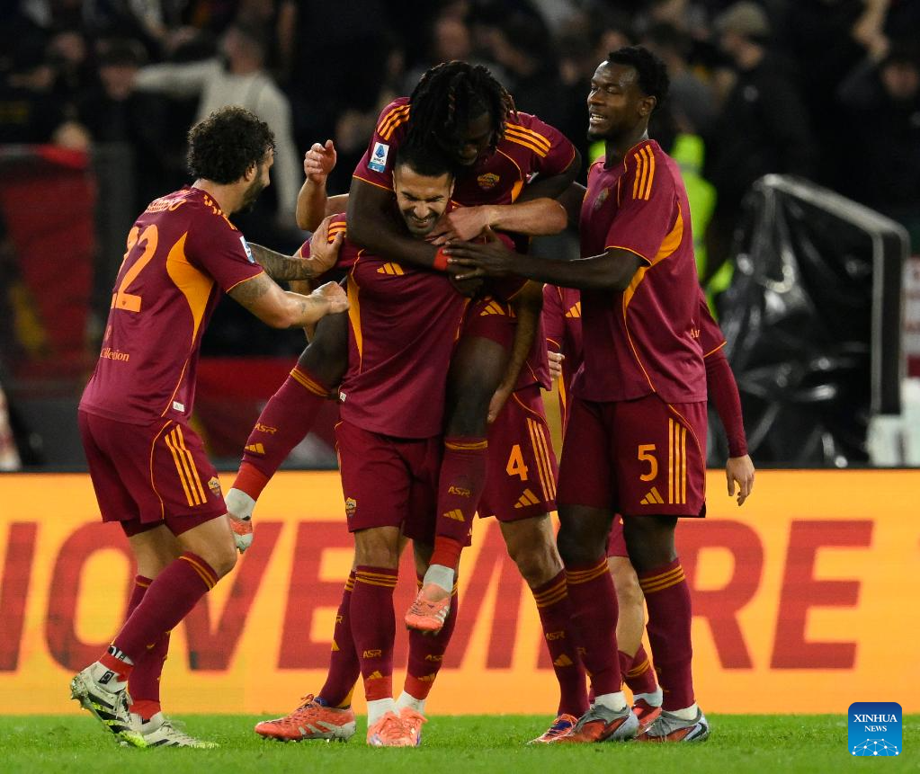 Roma's Zeki Celik (front C) celebrates his goal with teammates during a Serie A football match between Roma and Udinese in Rome, Italy, Nov. 9, 2025. (Photo by Augusto Casasoli/Xinhua)