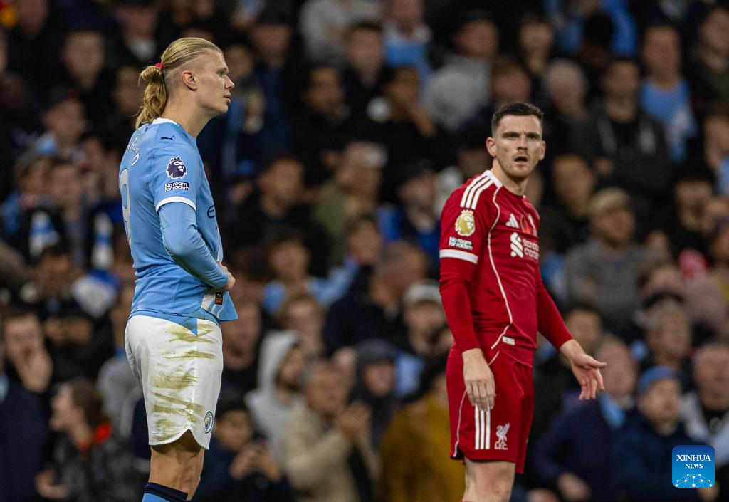 Manchester City's Erling Haaland (L) reacts after missing a penalty-kick during the English Premier League match between Manchester City FC and Liverpool FC in Manchester, Britain, on Nov. 9, 2025. (Xinhua)