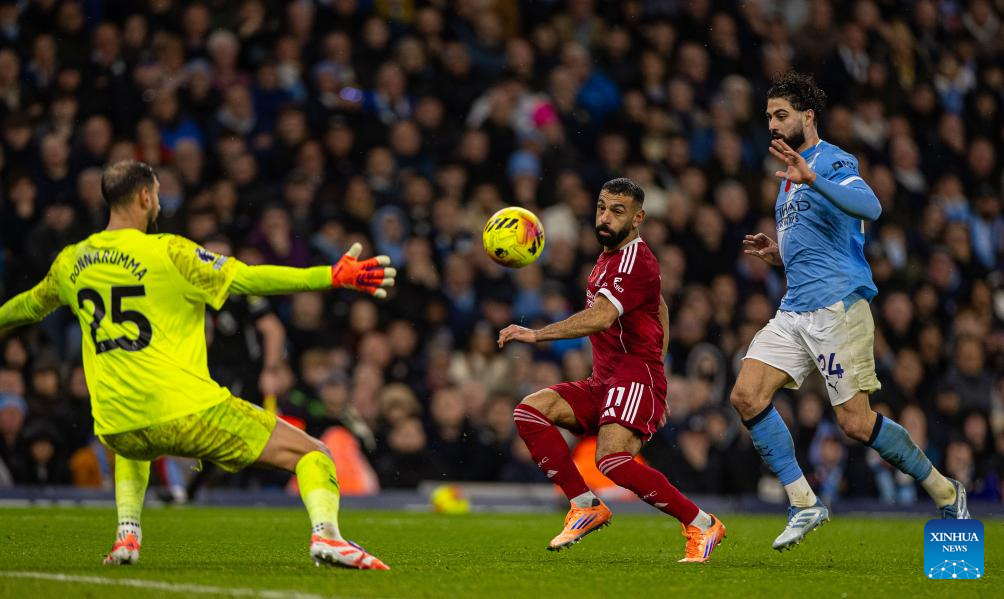 Liverpool's Mohamed Salah (C) competes during the English Premier League match between Manchester City FC and Liverpool FC in Manchester, Britain, on Nov. 9, 2025. (Xinhua)