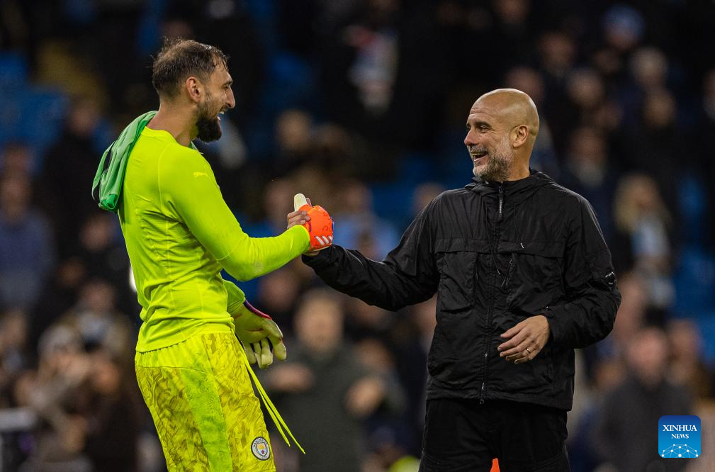 Manchester City's head coach Pep Guardiola (R) celebrates with Gianluigi Donnarumma after the English Premier League match between Manchester City FC and Liverpool FC in Manchester, Britain, on Nov. 9, 2025. (Xinhua)