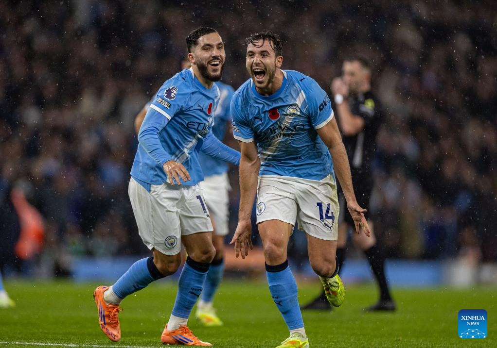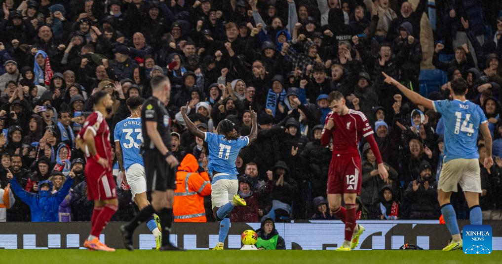 Manchester City's Nico Gonzalez (R) celebrates after scoring during the English Premier League match between Manchester City FC and Liverpool FC in Manchester, Britain, on Nov. 9, 2025. (Xinhua)