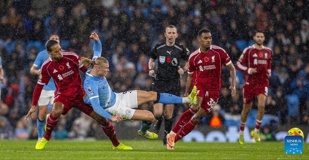 Liverpool's captain Virgil van Dijk (front, L) challenges Manchester City's Erling Haaland during the English Premier League match between Manchester City FC and Liverpool FC in Manchester, Britain, on Nov. 9, 2025. (Xinhua)