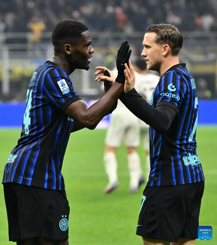 Inter Milan's Ange-Yoan Bonny (L) celebrates his goal with teammate Piotr Zielinski during a Serie A football match between Inter Milan and Lazio in Milan, Italy, Nov. 9, 2025. (Photo by Alberto Lingria/Xinhua)